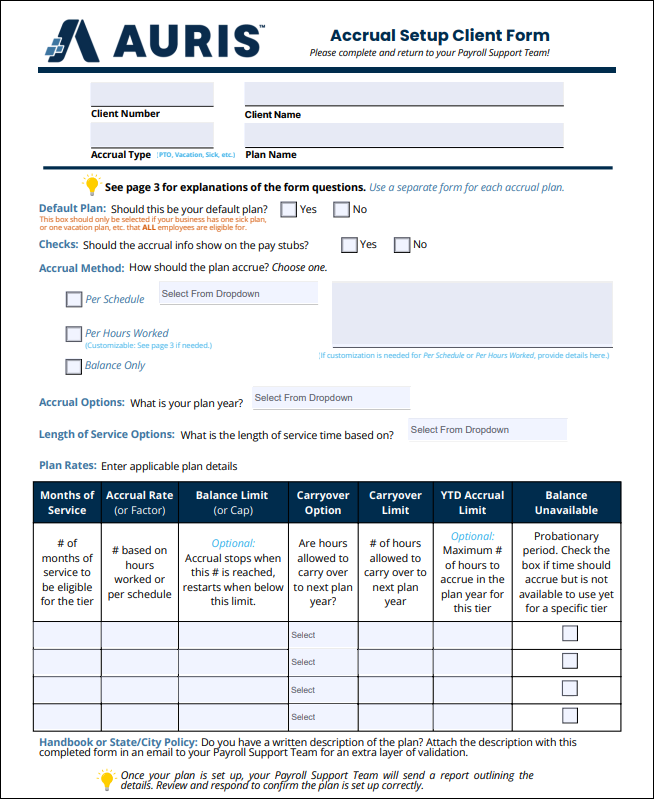 Accrual Setup Client Form Select the link for the Accrual Setup Client Form (4 pages). Accrual Setup Client Form.pdf 400 KB Download