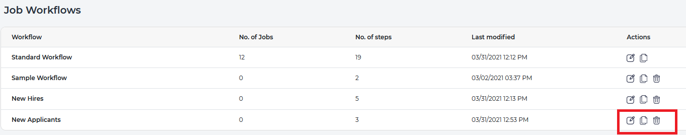 If you wish to edit, copy, or delete a specific workflow, you can select the respective icons on the right of the main page.