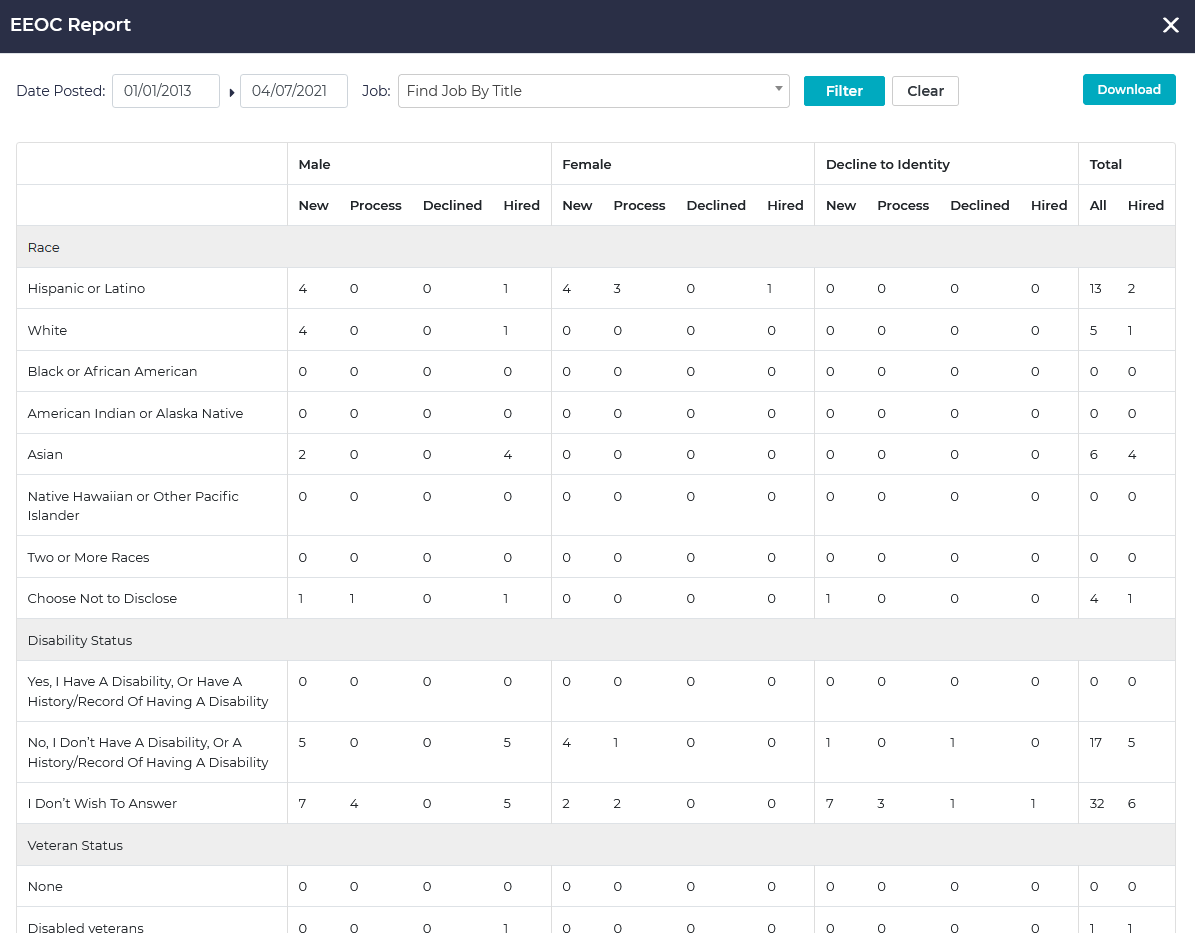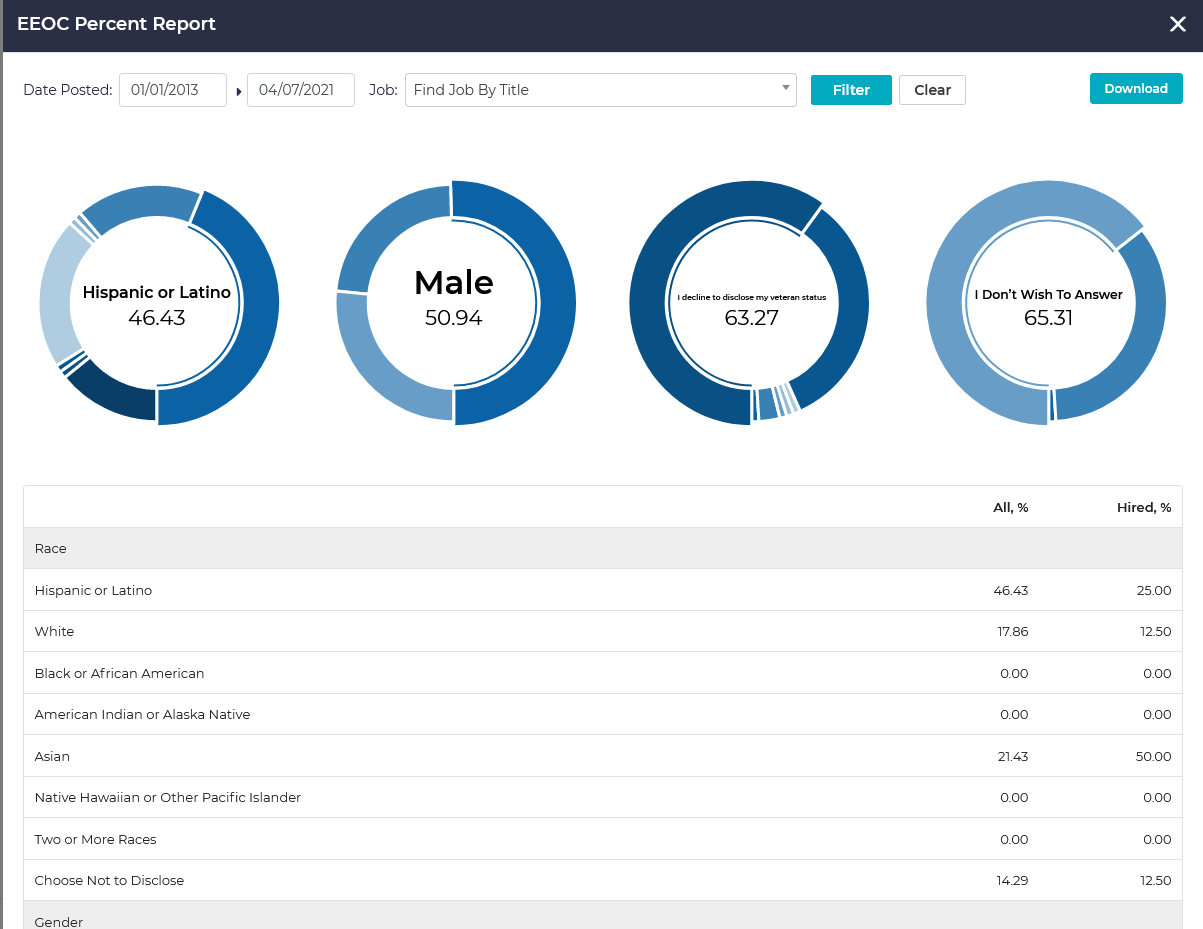 This report provides a division of the workforce by racial and ethnic groups. It is filterable by date posted and job.