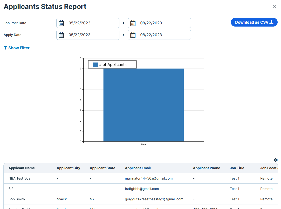 The Applicants Status report shows information about candidates, sorted by their workflow status. The graphic displays the number of applicants by status. This report is filterable by date, job title, and status, and includes the following information: