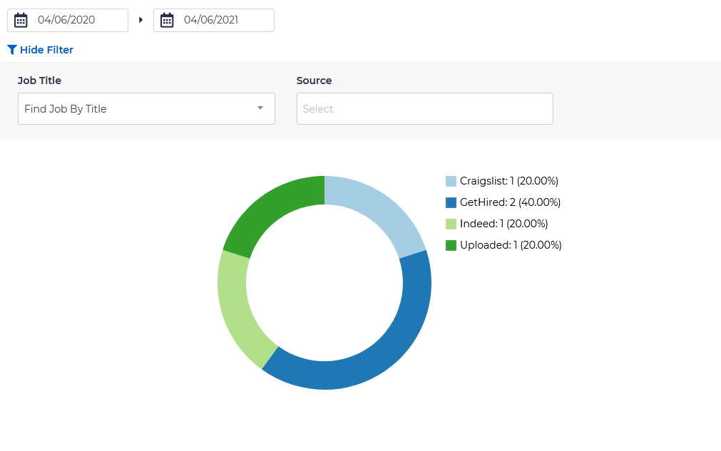 The applicants by source reports reveal the sources by which people have applied, such as which pages or job sites, where applications were made. This report can be filtered by date, job title, and source, and includes the following information: