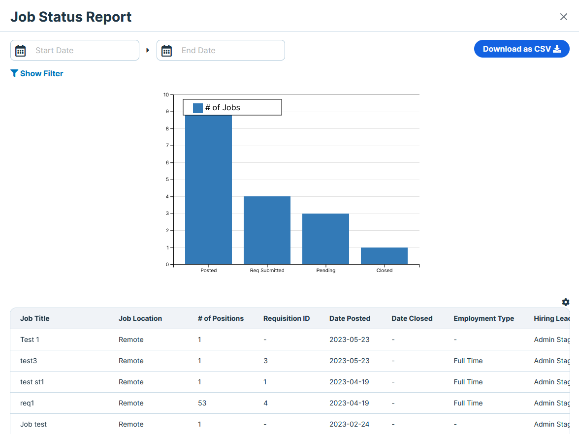The Requisition Report includes data about job requisitions and displays a graphic of number of requisitions per status. It is filterable by date, job title, and status, and includes the following fields: