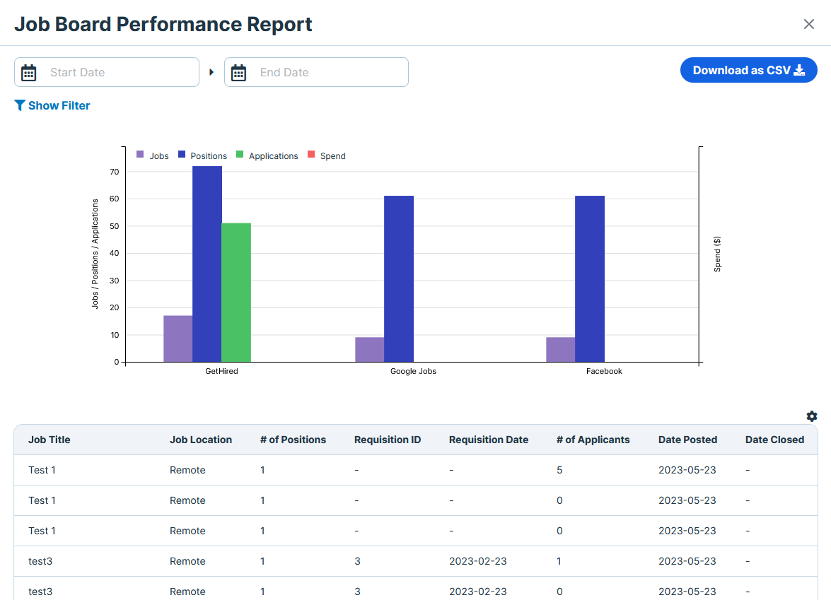 This report reveals trends in the performance of individual job boards over a specified time period. The graphic displays the number of jobs, positions, applications, and the amount spent per board. It is filterable by date, job title, status, and job board, and provides the following fields: