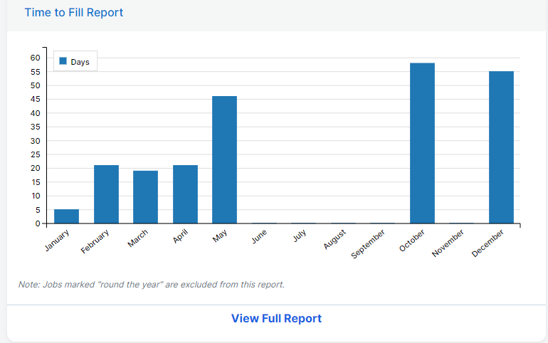 The time to fill report provides an analysis of how long it has taken to fill open positions. It is filterable by date, job title, and status, and includes the following data points: