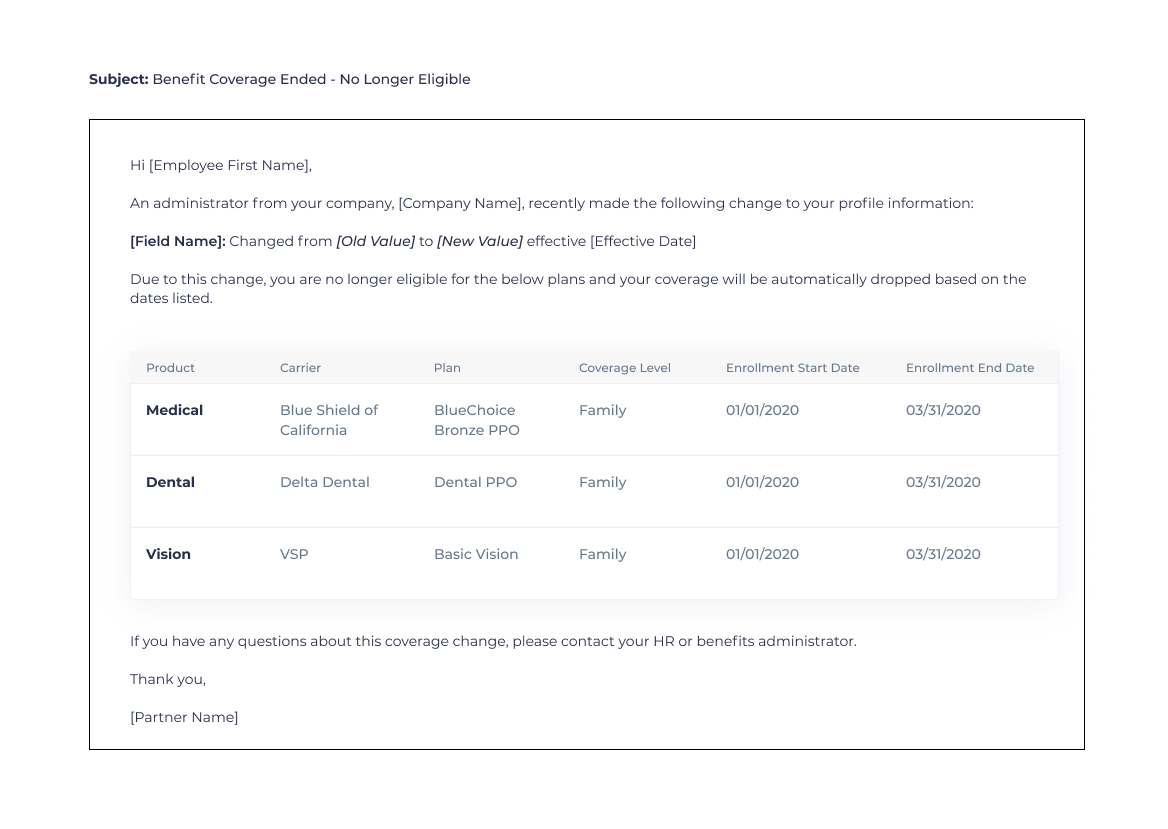 For all items that you have selected a Keep, the Ineligible Employees Enrolled in Benefits indicator will be updated to show this discrepancy. If Drop is selected for any plan, then the employee will be sent a No Longer Benefit Eligible email, with the changes that have been made: