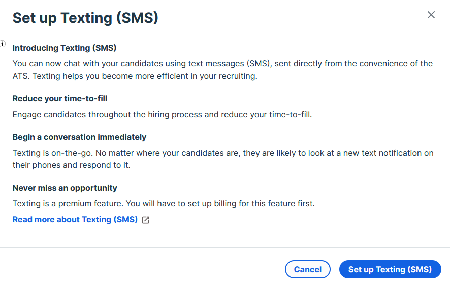 Before messaging candidates, the ATS account must have SMS enabled through the following process.