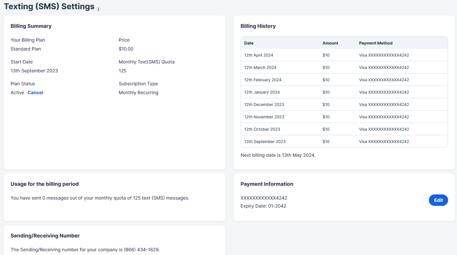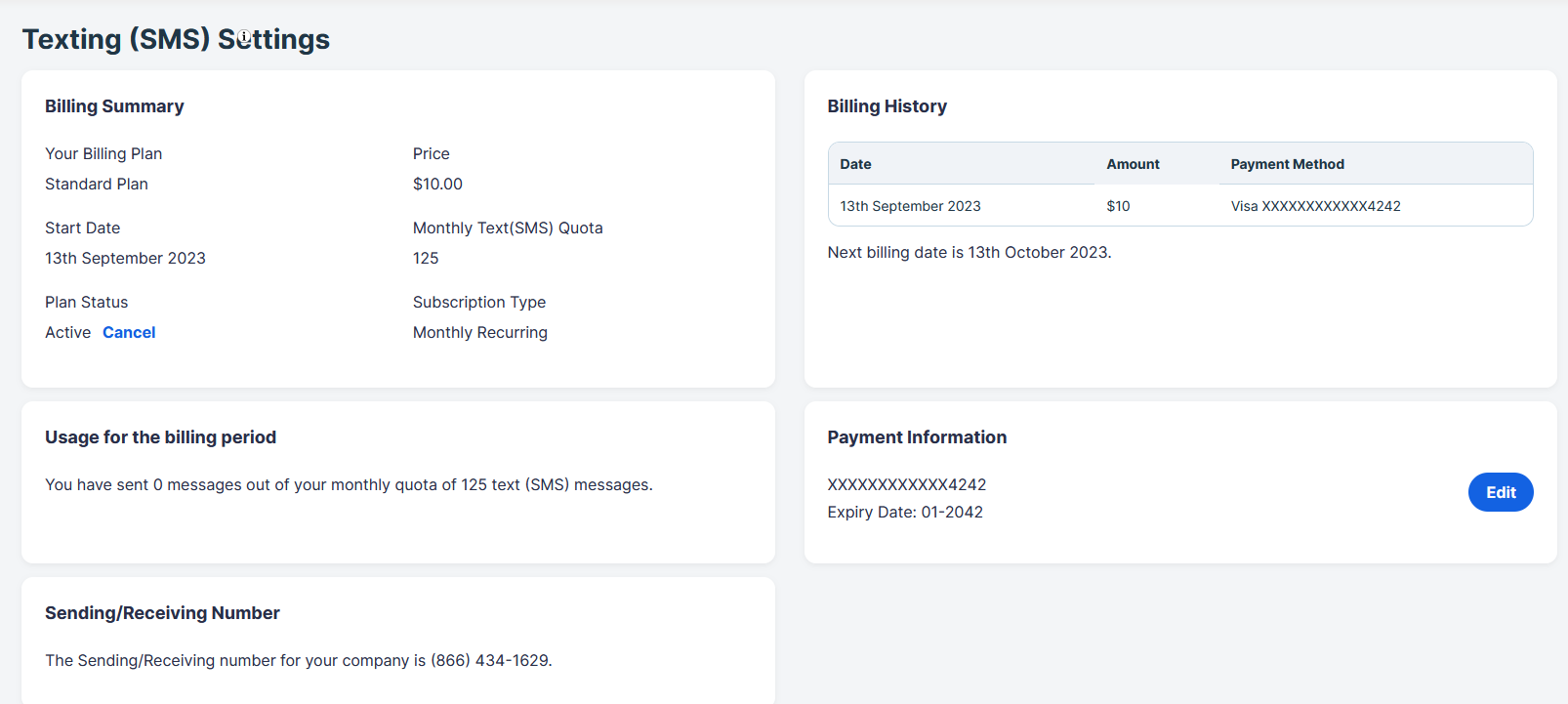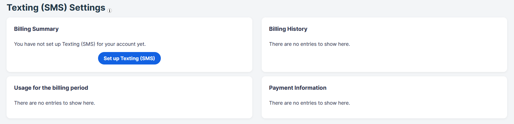 Once your application has been completed, your Texting (SMS) settings will be displayed: