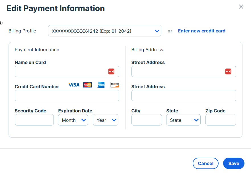 - Select the payment method to use, or select Enter new credit card to add a new payment method.