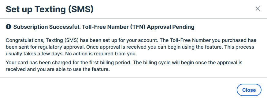 After submitting your payment information you will see an approval pending screen. The toll free number you have purchased will be approved for regulatory approval.