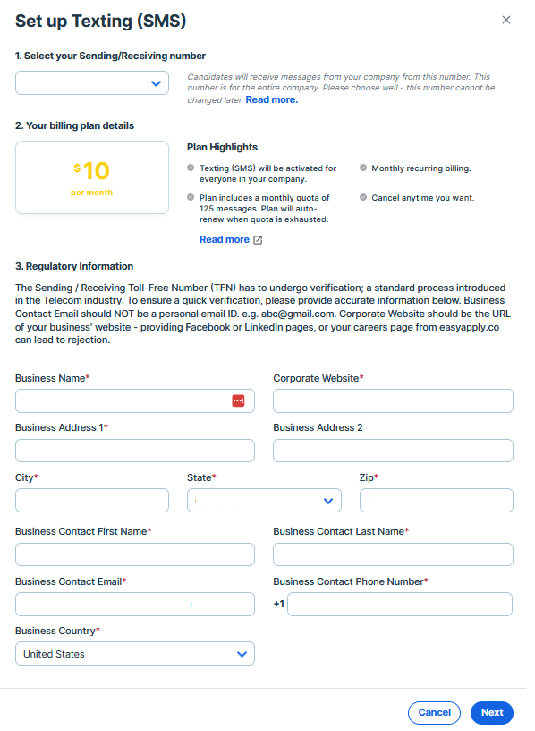 - Select your Sending/Receiving Number from the available dropdown. This is the phone number that will be used when sending and receiving SMS messages through ATS. Review the plan costs, and then select Next.