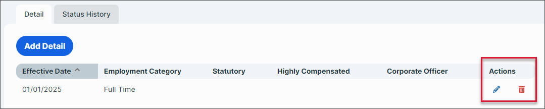 Edit existing employment information by selecting the Pencil icon under Actions. You can update employee data here without creating a new employment detail record. This edit option should only be used to correct employment information that was previously entered incorrectly.