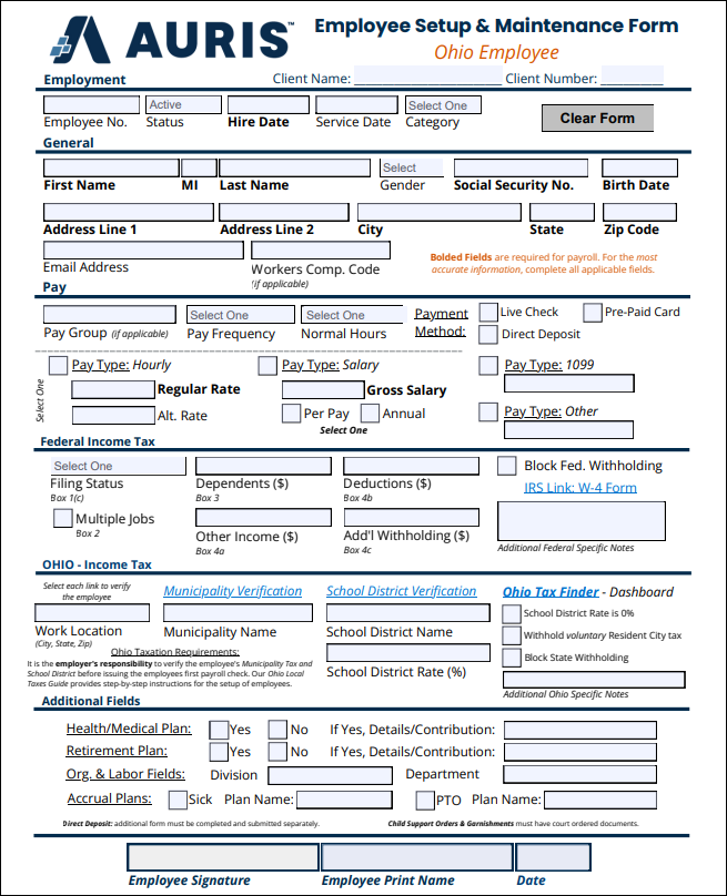 Ohio: Employee Setup & Maintenance Form Select the picture or the link for the Ohio: Employee Setup & Maintenance Form. Employee Setup & Maintenance Form - Ohio.pdf 200 KB Download