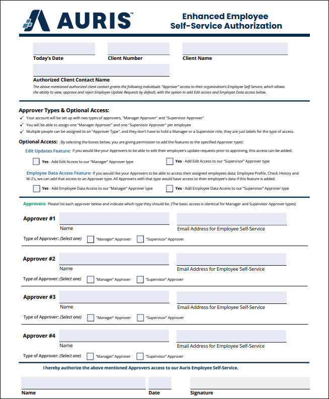 Enhanced Employee Self-Service Authorization Select the link for the Enhanced Employee Self-Service Authorization. Enhanced Employee Self-Service Authorization.pdf 200 KB Download
