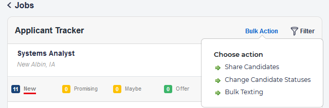 On the Applicant Tracker, select Bulk Action on the right, and choose Bulk Texting.