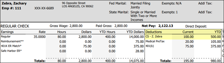 Your Payroll Support Team will title the deductions with the employee's name to make them easy to identify. In our example, the employee's name is Zachary Zebra, and the garnishment title “CS - Z. Zebra” translates to “Child Support - Zachary Zebra”.
