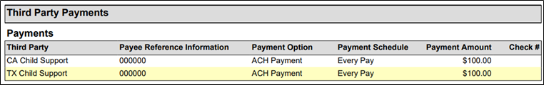 Certain states do not allow ACH payment for child support orders or are implementing the ability to submit electronic payments. A live third-party check can be created with payroll for states that are not yet eligible for ACH payments. It is the employer's responsibility to mail the check to the agency address on the order. The Check Register report will list all live checks processed with the current payroll run.