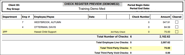 If a check is issued, those amounts will be listed in the Third Party Checks row and shown in the Amount column. If other third-party checks or electronic payments are issued with payroll, those will also be included in the grand totals.