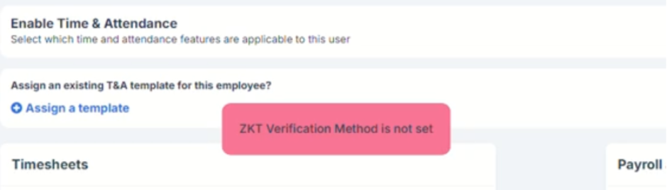 Previously, when ZKT Clock Integration was enabled, employees with clock options disabled in their profile would still trigger an error message stating that ZKT Verification Method is not set. This caused confusion for clients, as these employees were not intended to use the clock feature.