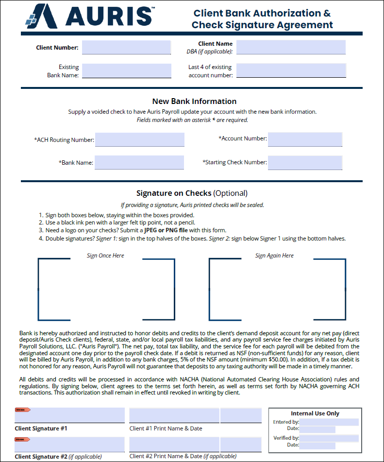 Client Bank Change Form Select the link to view/print the Client Bank Authorization & Check Signature Agreement. Client Bank Change Form.pdf 100 KB Download