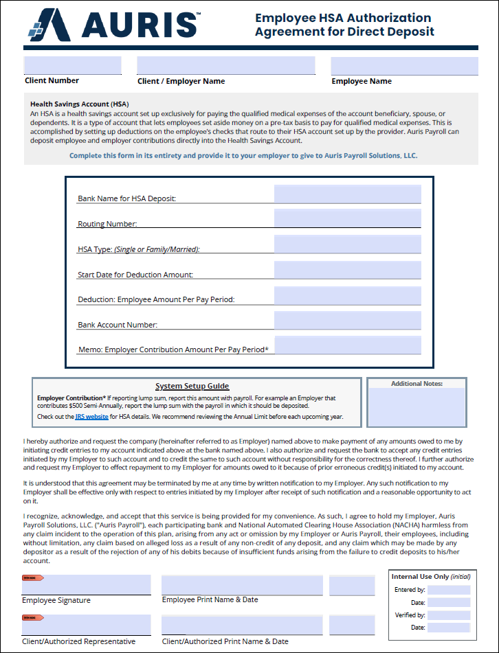 Employee HSA Direct Deposit Form Select the picture or the link for the Employee HSA Authorization Agreement for Direct Deposit. Employee HSA Authorization Agreement for Direct Deposit.pdf 100 KB Download
