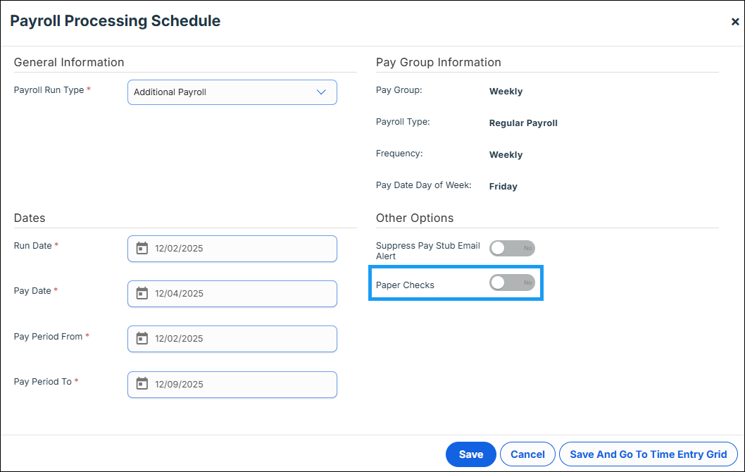 Paper Checks (Toggle): If you would like all live (paper) checks for this payroll, toggle to Yes. This will block all direct deposits and issue live checks.