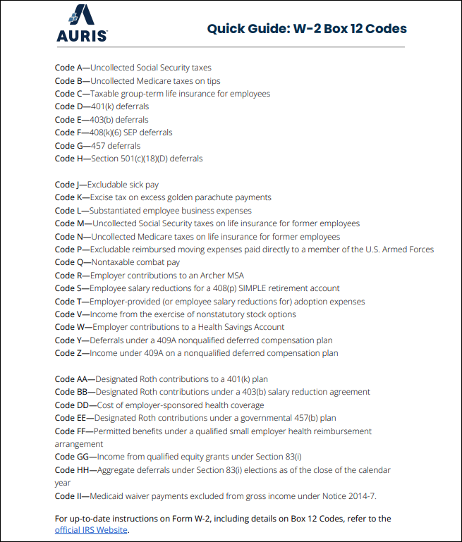 W-2 Box 12 Codes The image below is an example. Select this link for the guide with explanations of the W-2 Box 12 Codes. W2 Box 12 Codes.pdf 100 KB Download